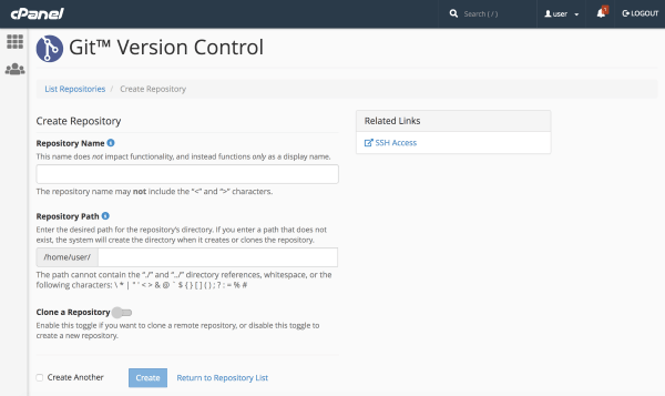 To create a new repository or add an existing repository to the list of cPanel-managed repositories, set the Clone a Repository toggle to disable.