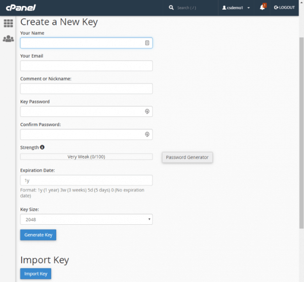 The cPanel Encryption interface allows you to create, manage and save GnuPG keys.