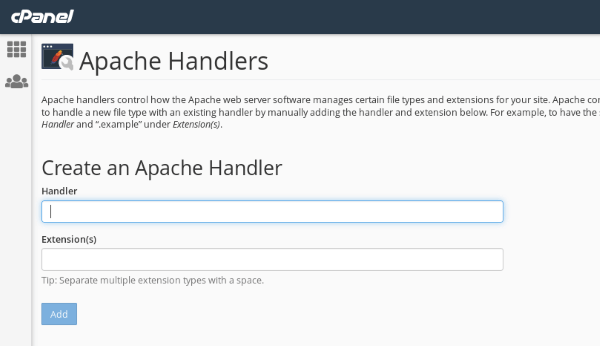 Apache handlers determine how the Apache web server processes specific file types and extensions on your website. By default, Apache is set up to handle CGI scripts and server-parsed files. If you want Apache to treat a new file type using an existing handler, you can add it manually below. For instance, to make the server handle files with a .example extension as CGI scripts, enter cgi-script in the Handler field and .example in the Extension(s) field.