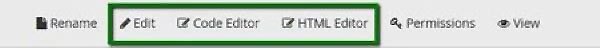 | HTML Editor | Files | Open the selected HTML file in a visual HTML editor. Warning: You cannot edit a file in this interface if it contains more than one megabyte (1 MB) of data. To edit the file, you must download it and use a local editor. |